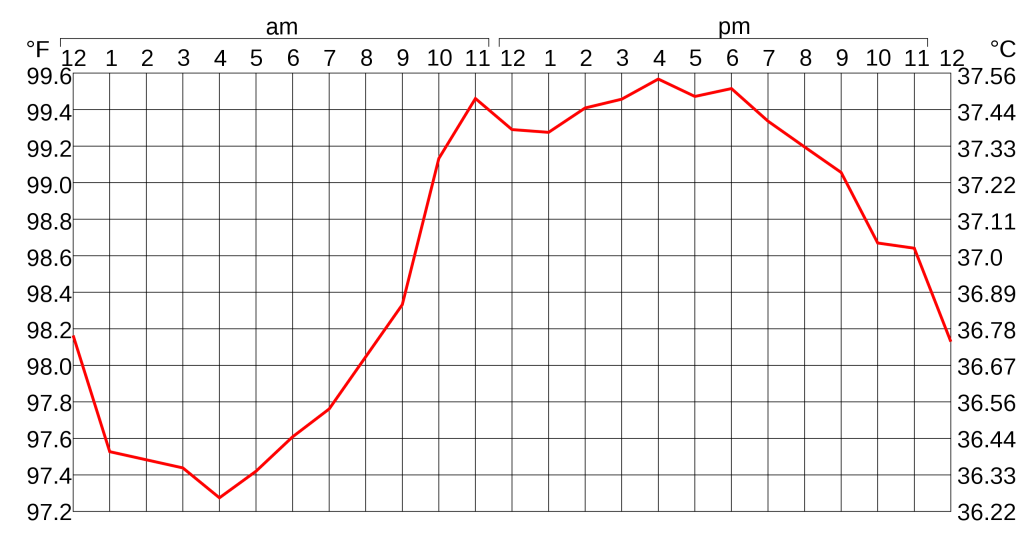 Përveç ndryshimit gjatë ditës, temperatura normale e trupit mund të ndryshojë gjithashtu deri në 0,5 ° C (0,9 ° F) nga dita në ditë, kështu që temperaturat më të larta ose më të ulëta në një ditë nuk do të korrespondojnë gjithmonë me temperaturën më të lartë ose më të ulët. diten tjeter.