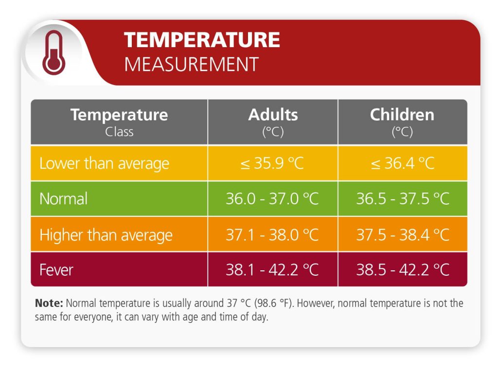 Temperatura normale e trupit të njeriut ndryshon pak nga personi në person dhe në kohë të ditës. Prandaj, çdo lloj matjeje ka një sërë temperaturash normale. Gama e temperaturave normale të trupit të njeriut, të marra nga goja, është 36,8 ± 0,5 ° C (98,2 ± 0,9 ° F), që do të thotë se vlerat normale të temperaturës të matura në këtë mënyrë janë midis 36,3 dhe 37, 3 ° C (97,3 dhe 99,1). ° F). Temperatura normale e trupit të njeriut shpesh quhet 36,5–37,5 ° C (97,7–99,5 ° F). Megjithatë, duke rishikuar literaturën, tek të rriturit, gjejmë një gamë më të gjerë të vlerave normale të temperaturës, nga 33,2 në 38,2 ° C (91,8–100,8 ° F), në varësi të gjinisë dhe vendndodhjes së matjes.